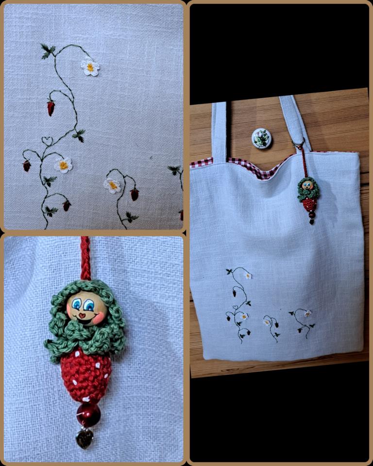 Die Tasche ist aus altem Bauernleinen und von mir per Hand bestickt. Die Erdbeerblüten sind von mir gehäkelt. Oben an der Tasche befindet sich ein Erdbeertaschenbaumler. Der Innenstoff ist ein rot-weiß karierter Baumwollstoff.