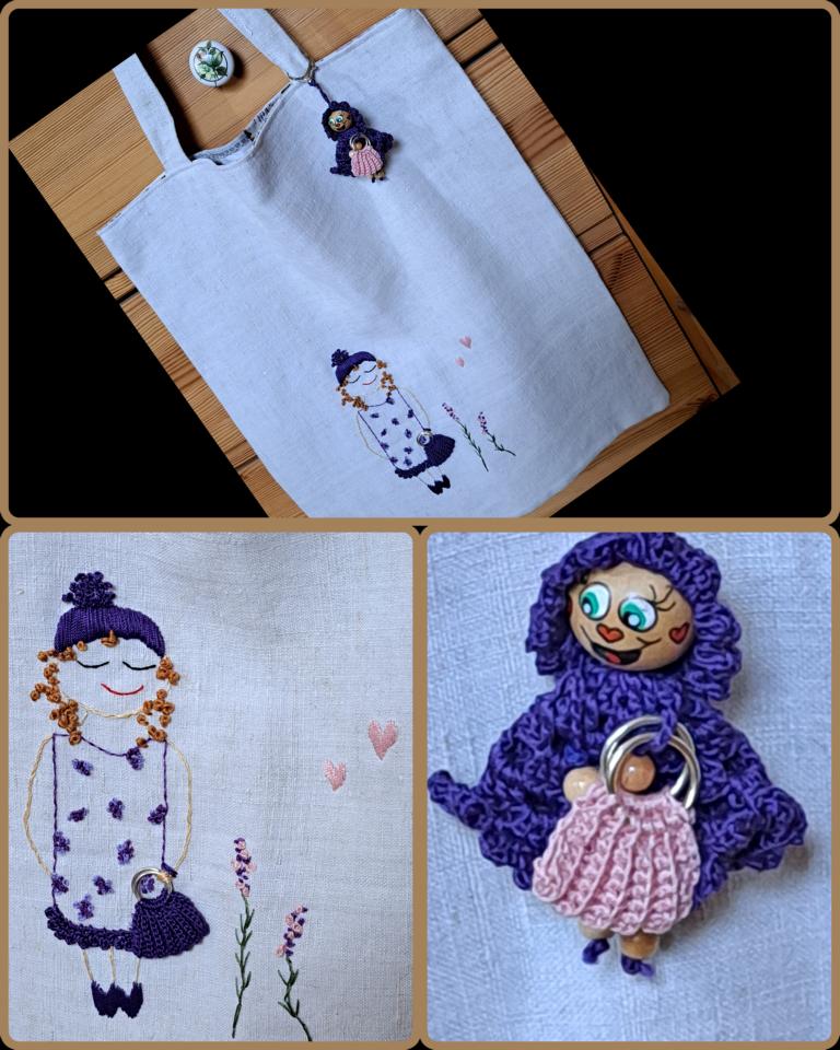 Das alte Bauernleinen ist von mir per Hand bestickt mit einem Mädel im lila Kleid. Die passenden Handtasche die das Mädchen in der Hand hält ist von mir gehäkelt. Oben an der Tasche ist ein Mädchen in lila von mir gehäkelt ebenfall mit einer gehäkelten Tasche.