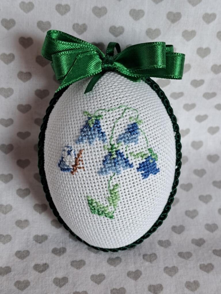 Du suchst nach einem wunderschönen Unikat für den Osterstrauch? Hier ist es für Dich! Mit blauen Glockenblumen bestickt und ein kleiner blau-weißer Schmetterling seitlich im Anflug. Die Rückseite ist ein weißer Stoff mit blau-grünem Blattmuster. Das Ei ist ca. 10 cm groß.