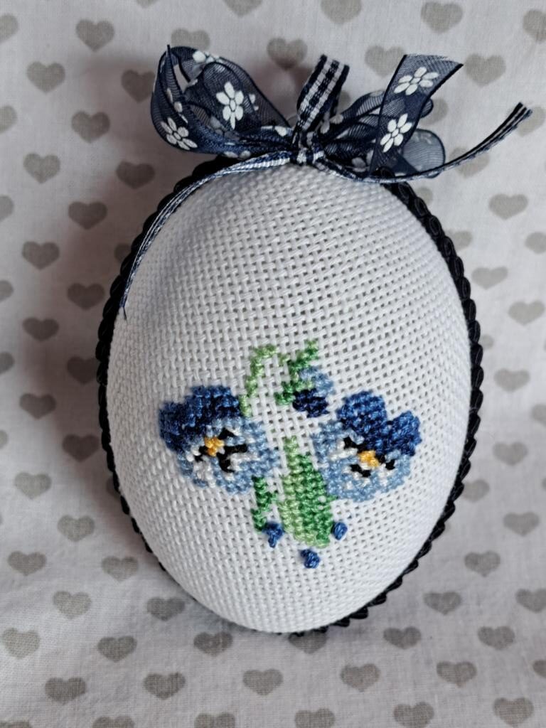 Du suchst nach einem wunderschönen Unikat für den Osterstrauch? Hier ist es für Dich! Mit blauen Stiefmütterchen bestickt. Oben hübsche Schleifen in blau-kariert und blau-weißer Blumenschleife. Mit dem karierten Band kann man das Ei auf den Osterstrauch hängen.